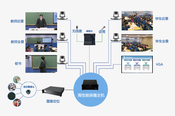 专业录播教室建设方案从摄影摄像角度构图取景, 采用仿真跟踪技术,通过配置高清摄像机可拍摄出广播级1080P60的细腻画面, 实现高质量精品教学课件;通过5台广播级摄像机分别负责对教师特写、学生特写、教师板书、教师全景、学生全景的拍摄,以进行课堂录制、直播、 远程互动及资源编辑,达到优质课程的高级录制效果。